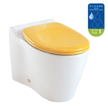 American Standard (Thailand) "Mini-Me" Kid back to wall vitreous china washdown horizontal outlet watercloset with yellow seat & cover; complied with BS3402:1969; test report QC2205-001; 3/4.7 LPF in WELS Grade 1; Registration No. WC 21-0153