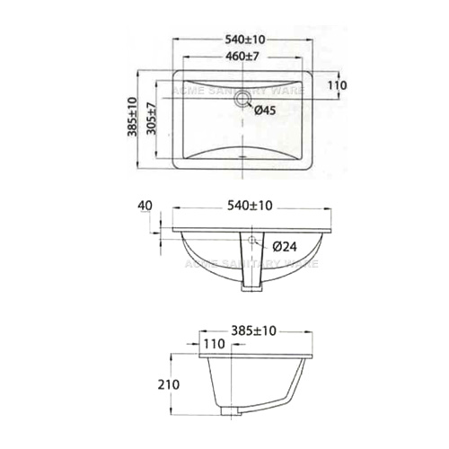 American Standard (PRC) "Milano" Rectangular undercounter basin 540mm with overflow hole