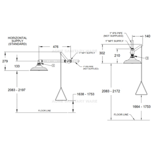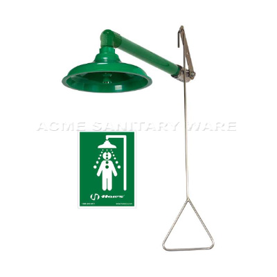 Haw (USA) Emergency shower horizontal or vertical include hydrodynamic designed ABS plastic showerhead with 20 gpm flow control, Schedule 80 PVC piping, Type 316 Stainless Steel ball valve equipped with stainless steel ball and stem, stainless steel pull rod with triangular handle