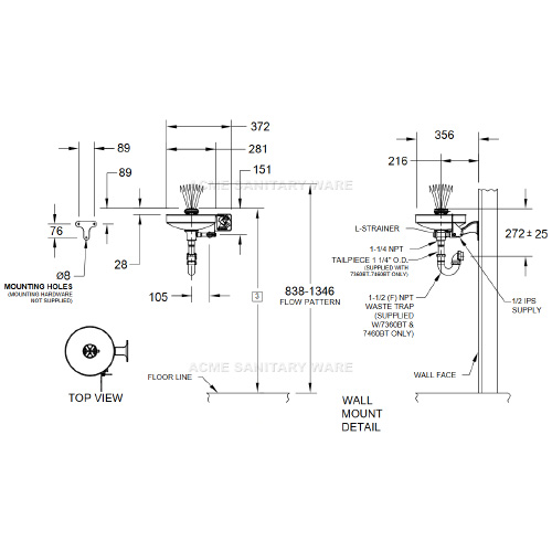 Haw (USA) Wall mounted eye and face wash include stainless steel 11" (27.9 cm) round bowl, 3.7 gpm flow control,chrome-plated brass stay-open ball valve equipped with stainless steel ball and stem, and chrome-plated brass in-line 50 x 50 mesh water strainer