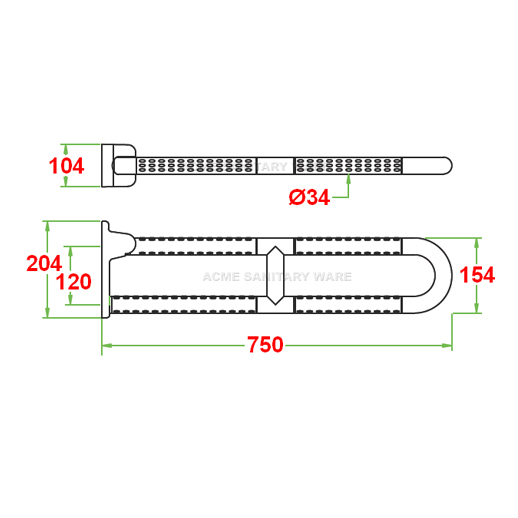 EMCA (PRC) Ø32 x 750mm long stainless steel 304 hinged support rail in Satin Finish; BS12:1978 & BS882:1973 capable of carrying a static loading test 150kg ; test report J17176 ; complied with Barrier Free Access 2008