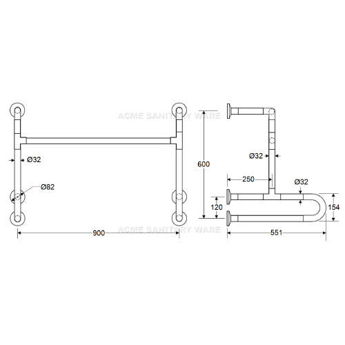 EMCA (PRC) Ø32 x 600 x 600mm long stainless steel 304 L-shape grab bar in satin finish ; GB 175-2007 ; capable of carrying a static loading test 150kg ; test report J23743 ; complied with Barrier Free Access 2008