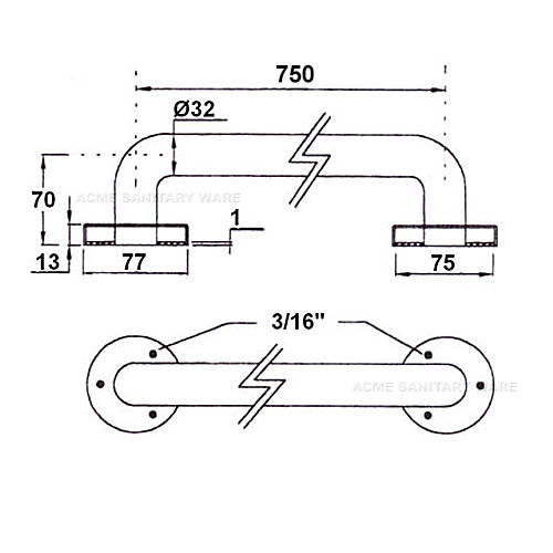 EMCA (PRC) Ø32 x 750mm long stainless steel 304 hinged support rail in Satin Finish; BS12:1978 & BS882:1973 capable of carrying a static loading test 150kg ; test report J17176 ; complied with Barrier Free Access 2008