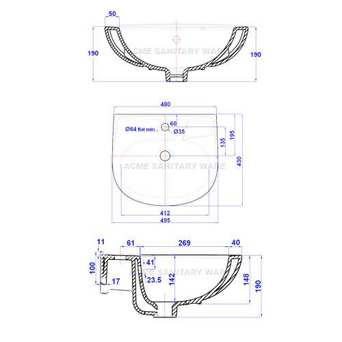 American Standard (Thailand) "New Codie" Vitreous china wall hung washbasin; tested on BS 1188:1974 & BS 3402:1969; test report J 27665 & QC-2112-004