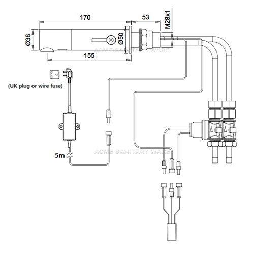 Stern (Israel) "Tubular 1000" Chrome plated wall-mounted sensor mixer with adjustable temperature limiter in AC Supply with 5m wire AC 110-240 Vac 50/60Hz to 9V 0.3A IP68 waterproof switching transformers